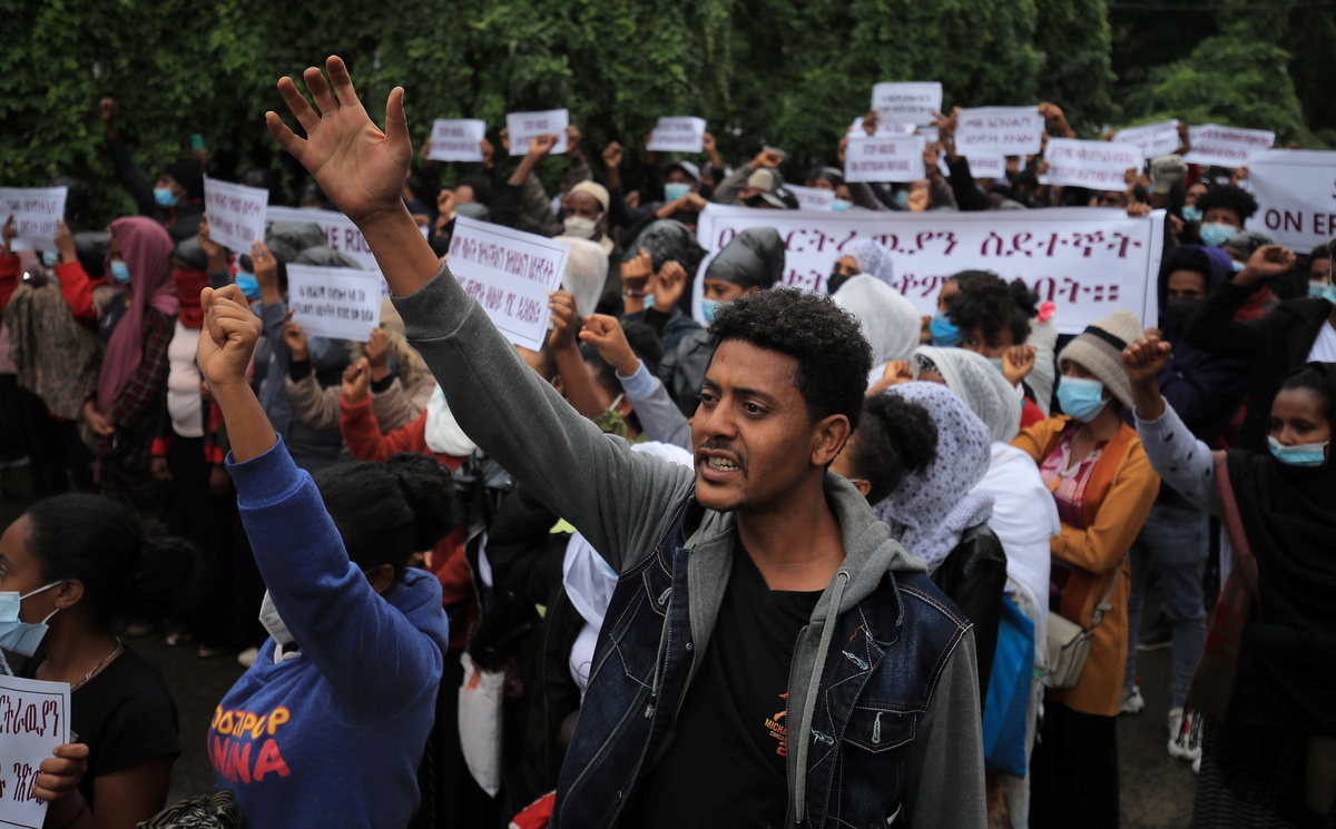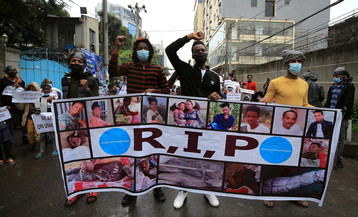 Hundreds of Eritrean refugees protested in the Ethiopian capital on Thursday, calling on the United Nations refugee agency to relocate friends and family who they say are trapped in two refugee camps by fighting in the Tigray region.