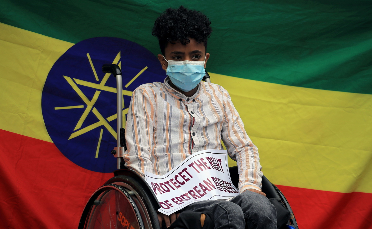 Some demonstrators on Thursday held a banner reading "Protect the rights of Eritrean refugees".