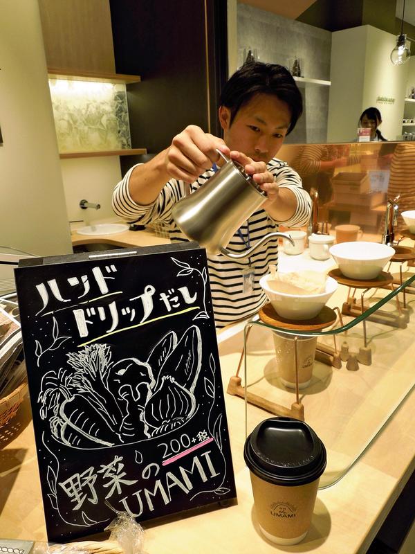 This shop is named On the Umami, and it offers just "hand drip" dashi stock at 200 yen per cup, before tax. The regular flavor comes from dried tuna flakes combined with dried vegetables, and a seasonal flavor using chicken and kombu seaweed is scheduled to be available through mid-April.