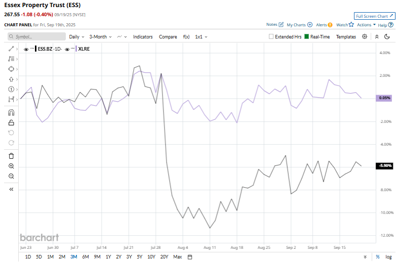 Essex Property Trust’s stock dropped 15.4% from its 52-week high of $316.29. Shares of ESS have declined 5.8% over the past three months, lagging behind the Real Estate Select Sector SPDR Fund’s (XLRE) marginal rise.