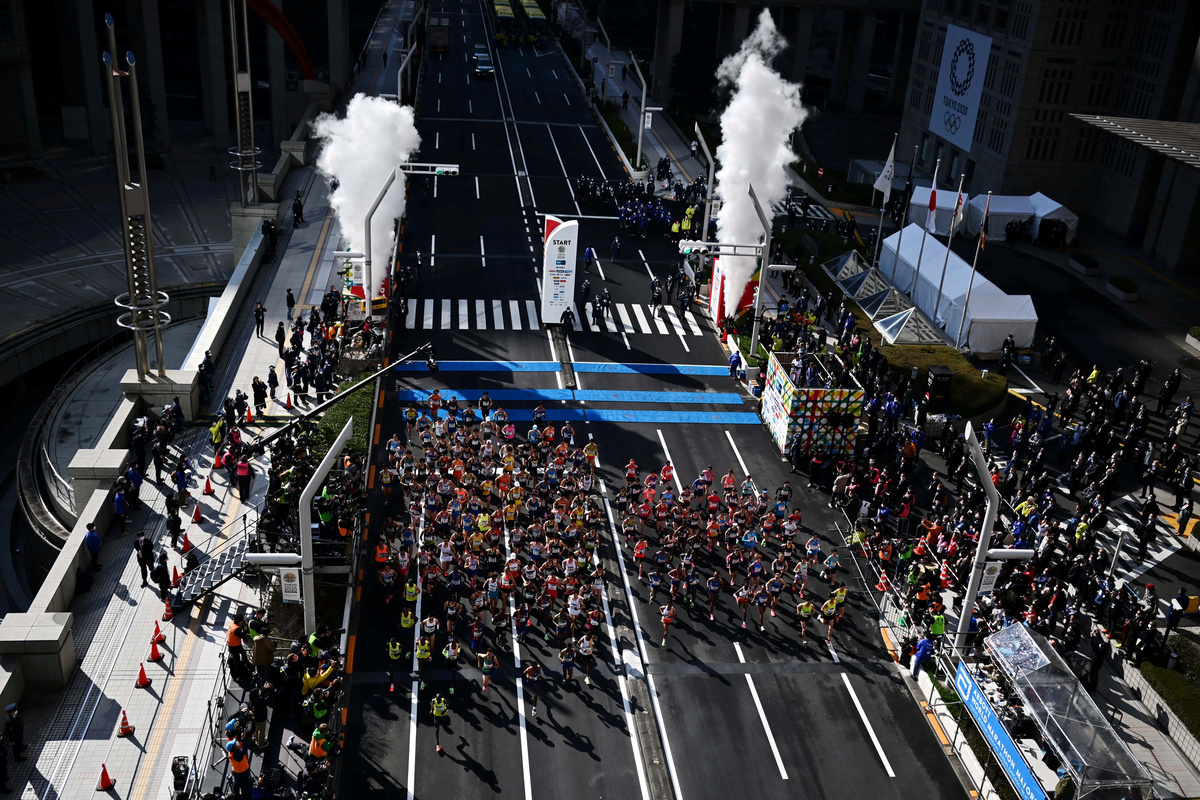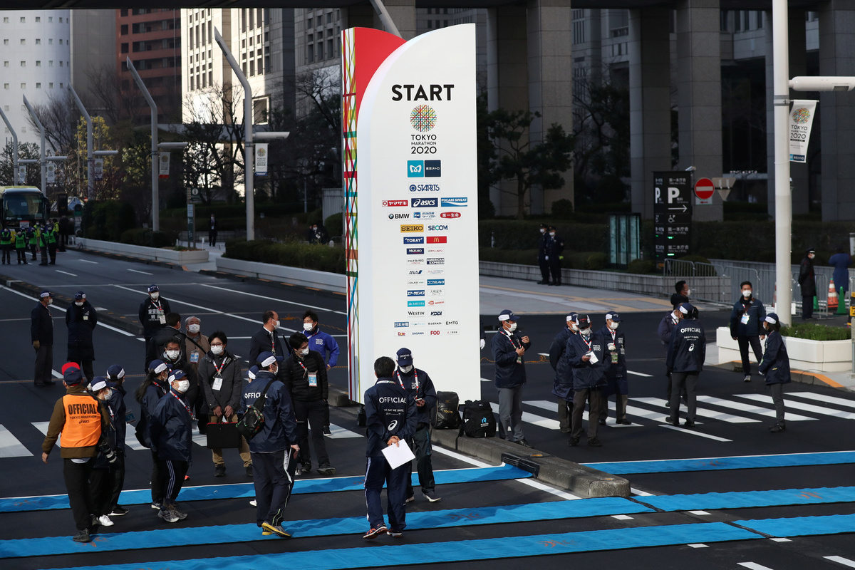 Locals were strongly discouraged from lining the route because of the coronavirus outbreak, and the race was restricted to a few hundred elite athletes, without the usual retinue of more than 30,000 amateur runners to limit the risk of infection.