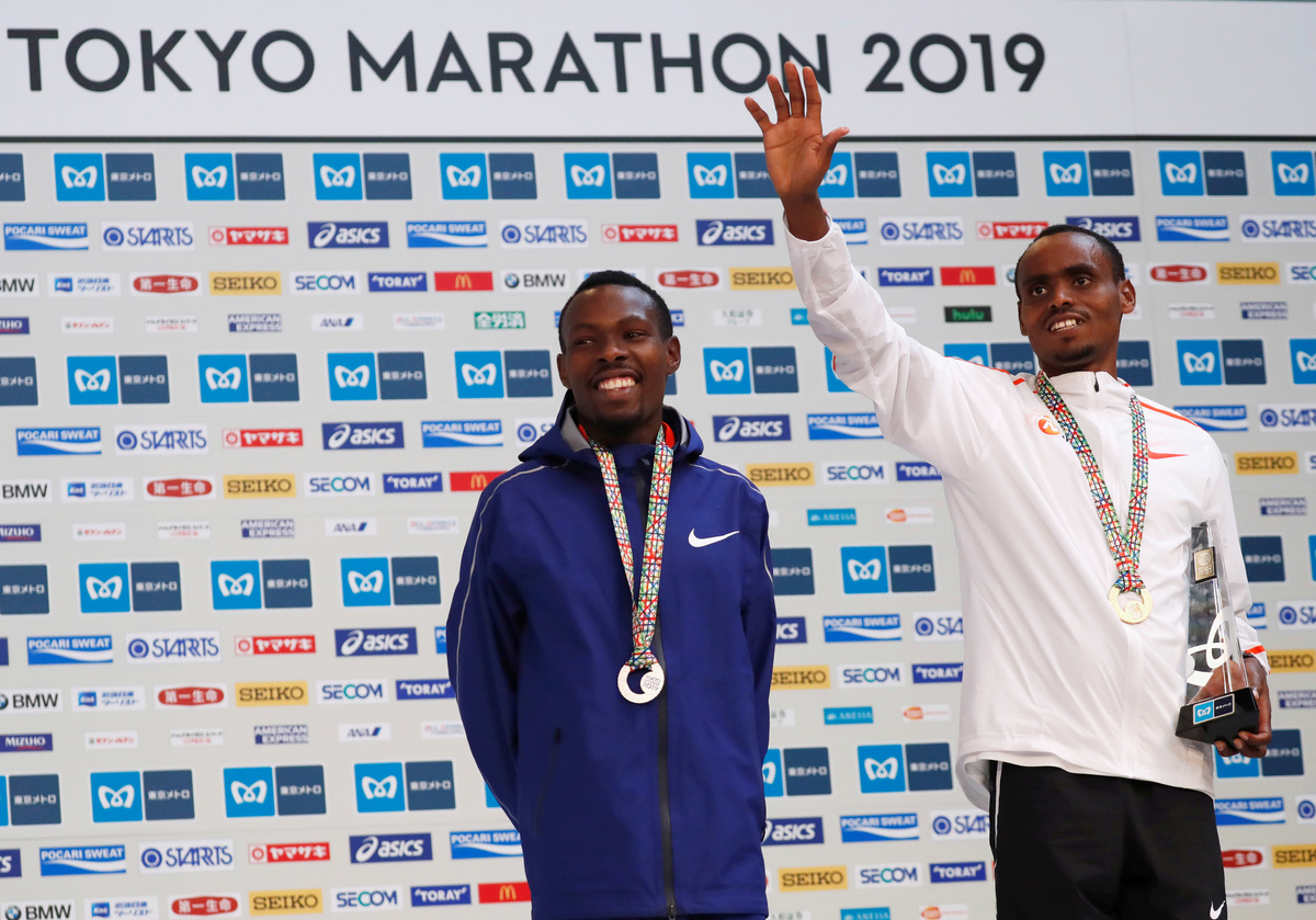 Athletics - Tokyo Marathon 2019 - Tokyo, Japan - 03/03/19 - Gold medalist Birhanu Legese of Ethiopia and silver medalist Bedan Karoki of Kenya at the awarding ceremony. REUTERS/Issei Kato