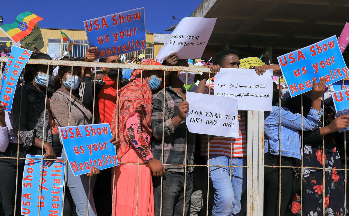 More than 10,000 people attended the rally, some carrying banners written in English, Arabic and Amharic. Slogans included: "USA show us your neutrality", "Ethiopia doesn't need a caretaker", and "Fill the dam", a reference to a huge Nile dam opposed by Egypt and Sudan.