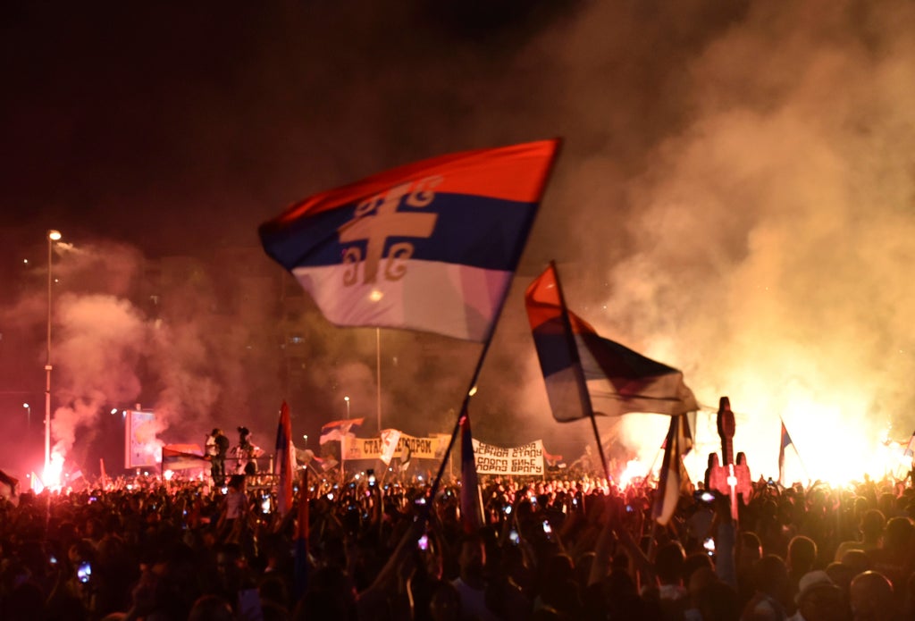 Illustrating the deep ethnic divide, thousands of people waving Serbian flags gathered in front of the main Serbian Orthodox church in Podgorica on Saturday to welcome the patriarch. Many were bused to the capital from Serbia.