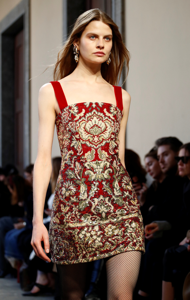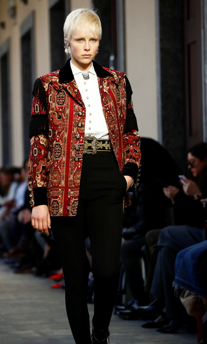 Wearing a red tapestry print jacket, white shirt and tight black trousers, model Edie Campbell opened the show in the cloisters of the 19th century Conservatorio Giuseppe Verdi.