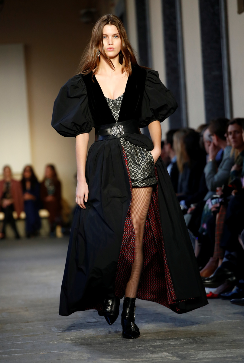 A selection of black dresses came in velvet with puffed up off-shoulder sleeves, embroidered with metallics or in chiffon. Some of the dresses were reminiscent of royal gowns.