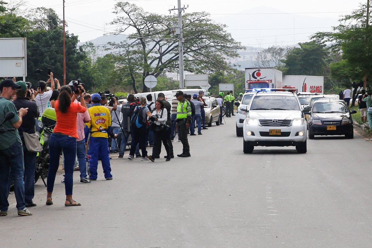 Escorted by police motorcycles, the trucks pulled into Cucuta, where Venezuelans were waiting to see whether Maduro's government would clear the border road he has blocked and allow the humanitarian shipments to pass.