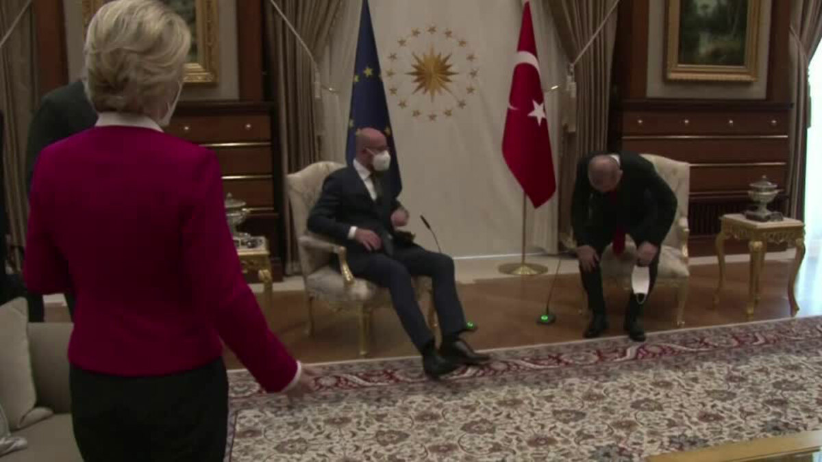 Footage from their meeting on Tuesday showed the first female head of the EU executive, the only woman in the talks, gesturing in disbelief and uttering a surprised sigh as Erdogan and European Council President Charles Michel took the two centre-stage seats prepared, relegating her to an adjacent sofa.