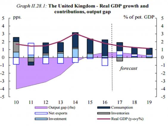 The Commission's forecasts for the UK are close to those of the OECD, which forecast last month for UK GDP growth to be 1.6 per cent this year, before slumping to just 1 per cent in 2018.