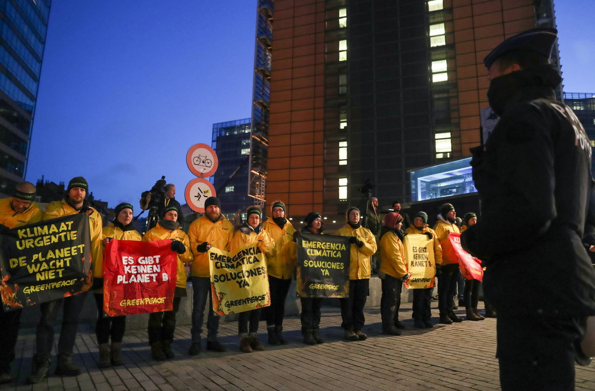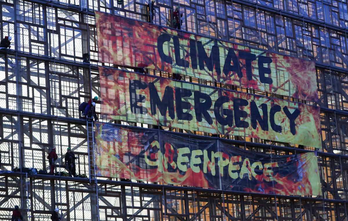 Underlining the stakes, Greenpeace climate activists scaled the glass-fronted Europa building where leaders meet, unfurling banners reading "Climate Emergency", firing off red flares and blaring fire alarm sirens.