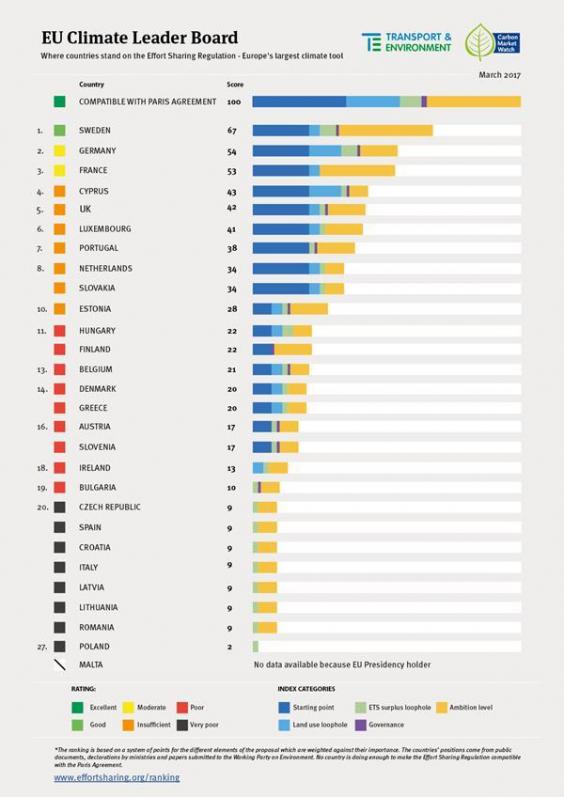 The new EU Climate Leader Board was compiled by awarding points to countries which back strengthening the “Effort Sharing Regulation”, a proposed law which is currently being negotiated.