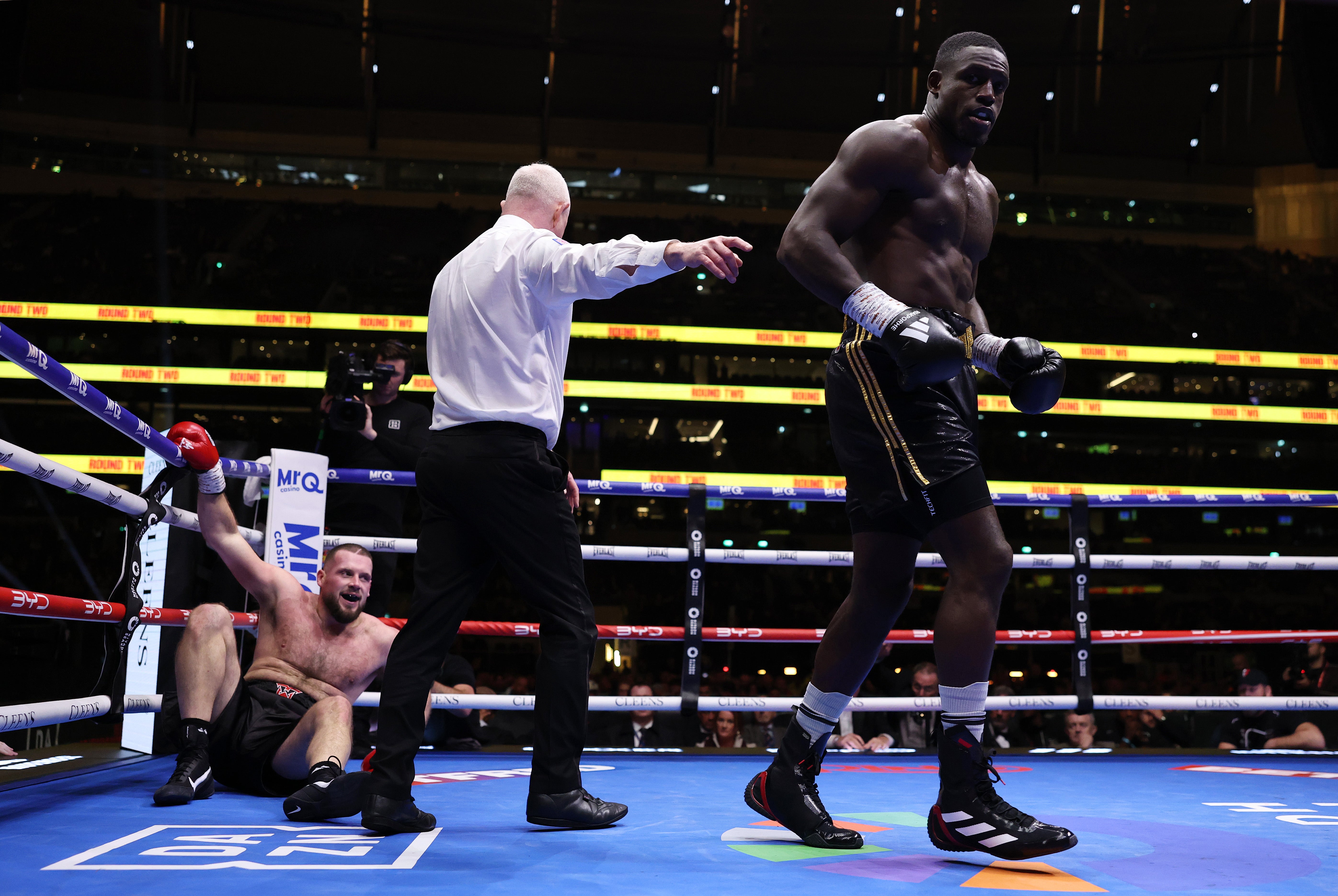 Saturday 15 November 2025 21:29 , Alex PattleApplause now, as Essuman is finally standing again after receiving oxygen.