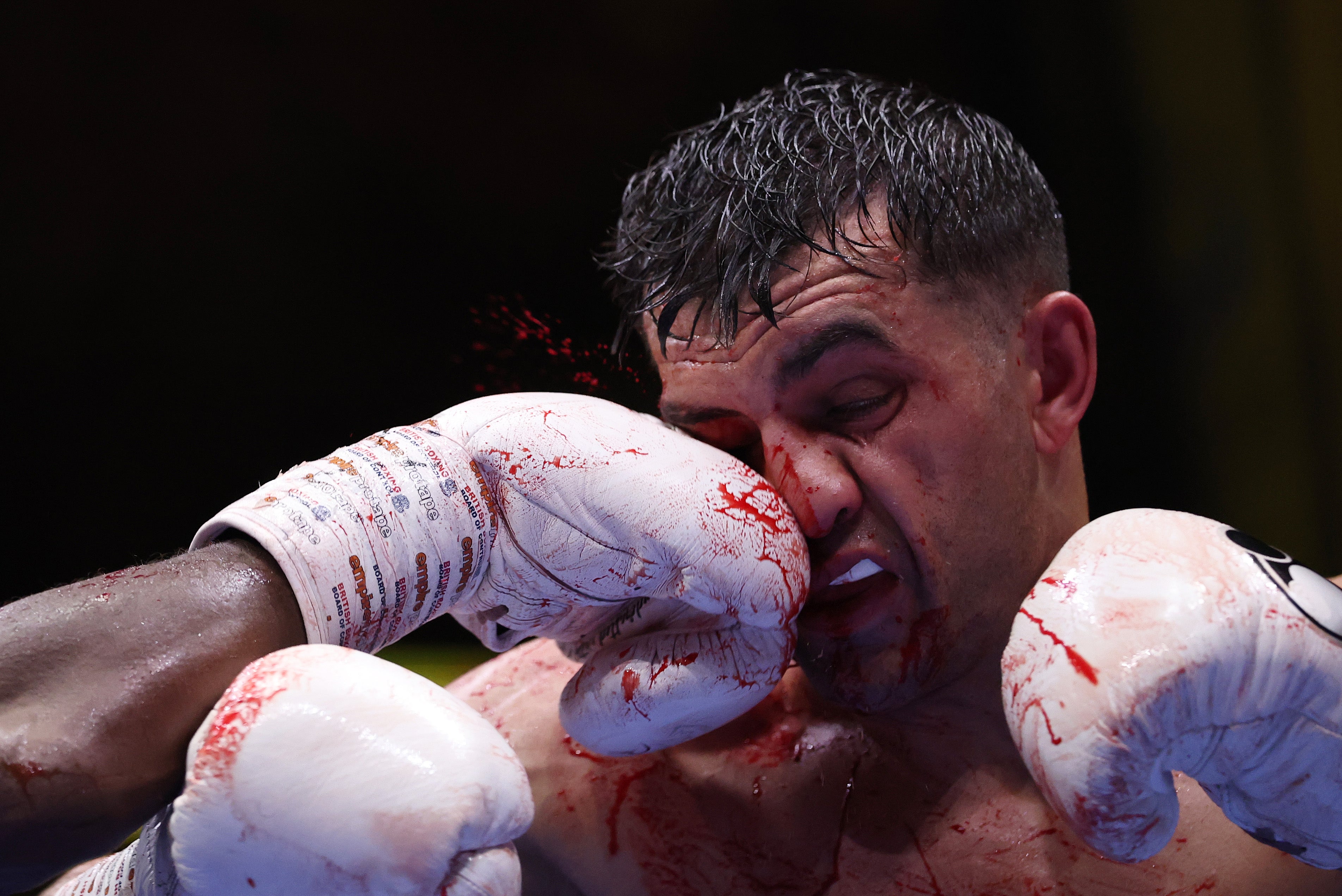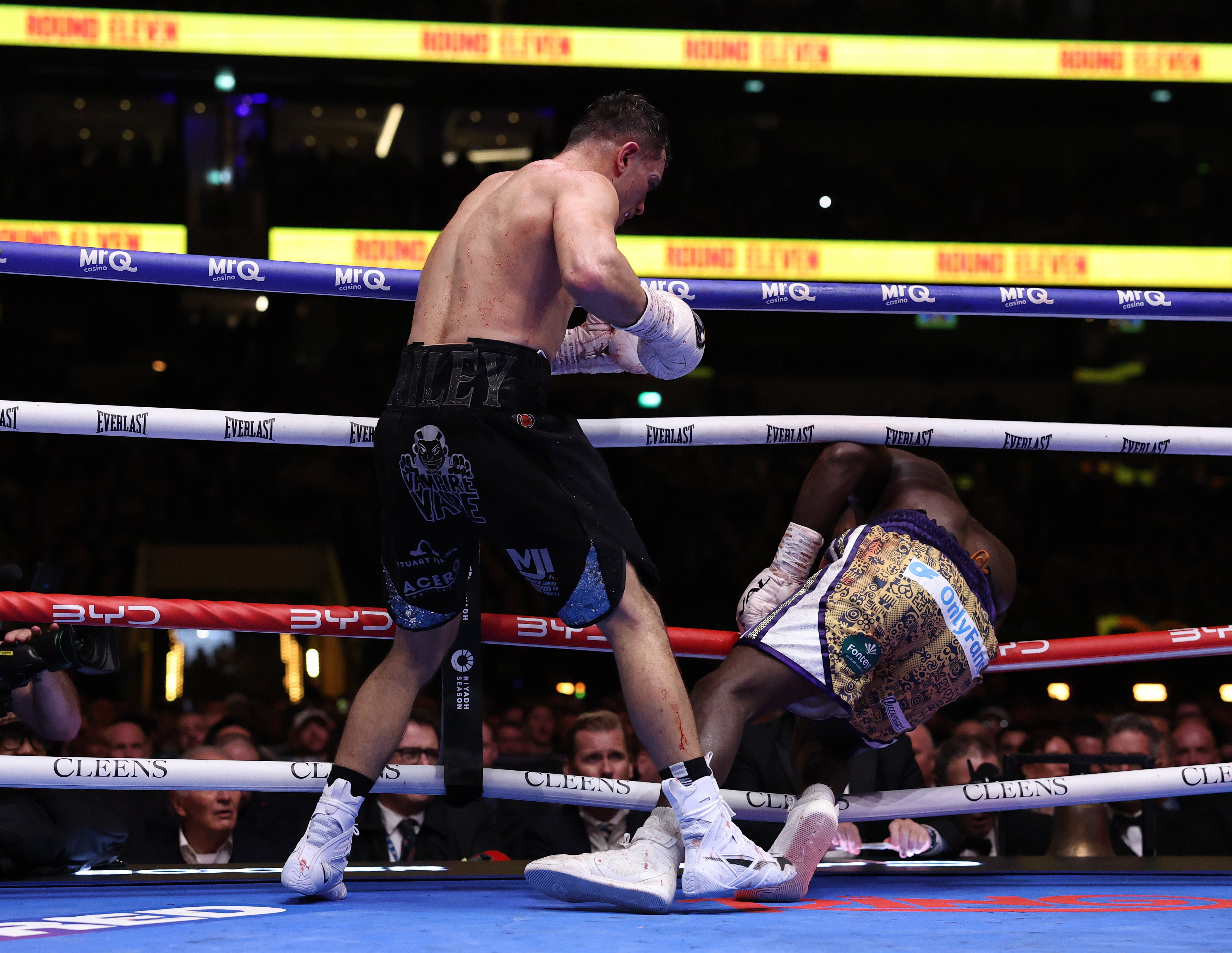 But back in the ring, he’s put under more pressure from the Engine. Catterall is pawing at his cut, too, as blood streams down his face.