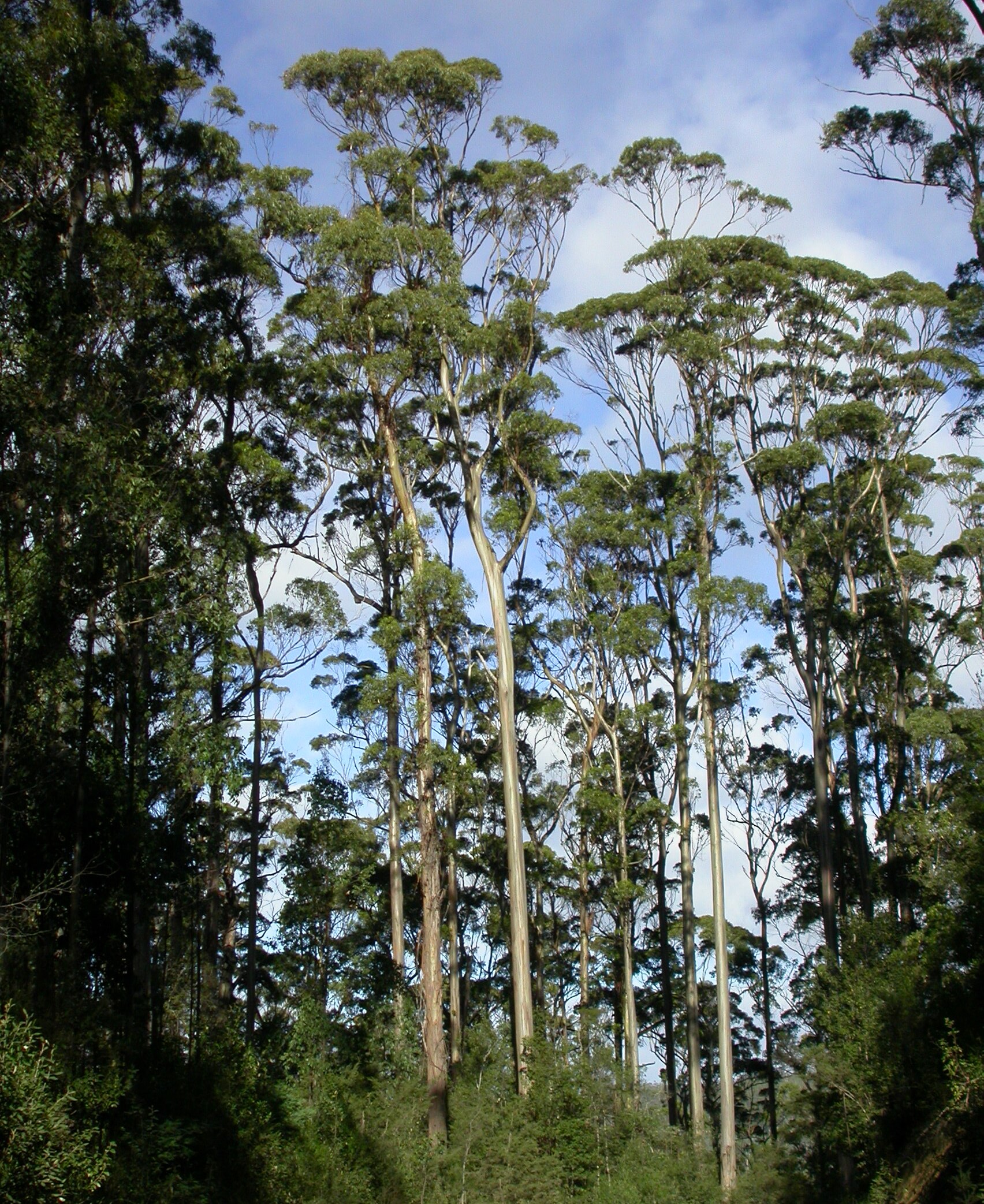 Some of the youngest species include the tall forest trees in south-east Australia and Tasmania, such as the mighty mountain ash (E. regnans) and the Sydney blue gum (E. saligna).