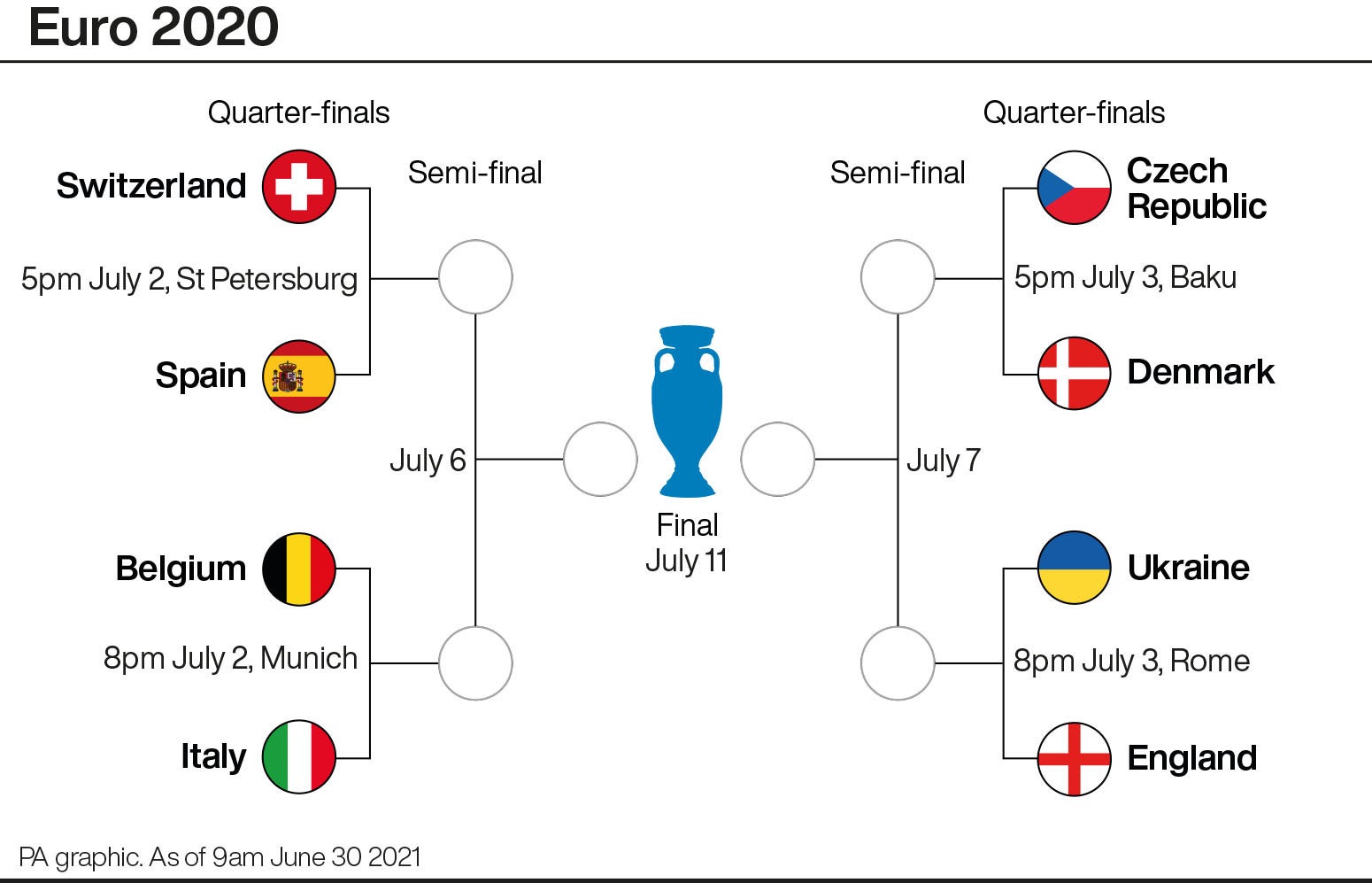 Switzerland v Spain (Quarter-final, July 2, St Petersburg, 1700 BST)Belgium v Italy (Quarter-final, July 2, Munich, 2000 BST)