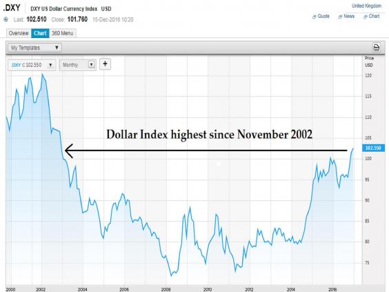 Meanwhile, the dollar surged to its highest level against a basket of major peers since 2002 after only the second rate hike since the global economy faced meltdown in 2008.
