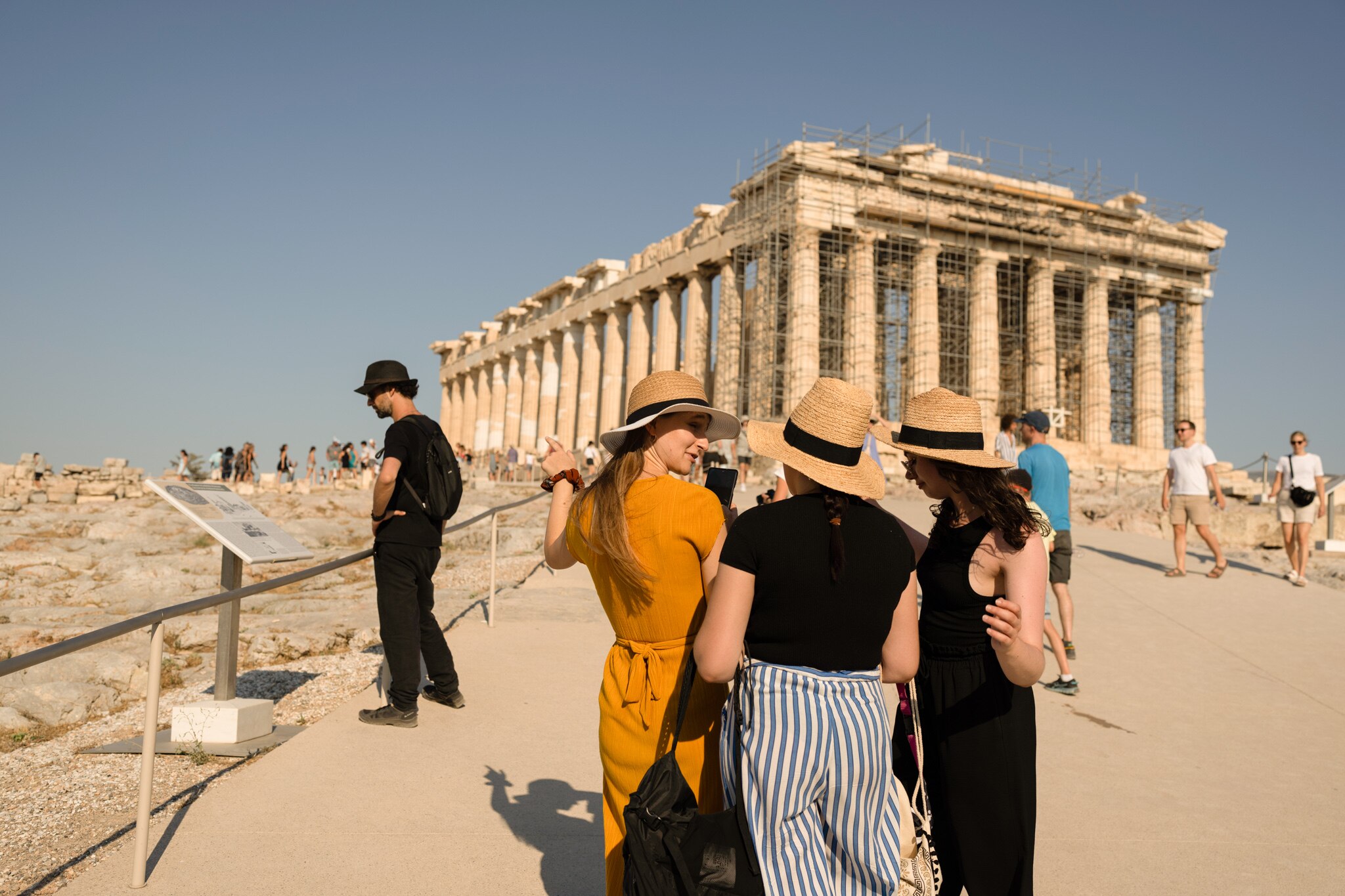 A mixture of tourists and locals linger on Athen's cobbled streets, or navigate the many narrow alleyways of Mykonos and Santorini, their cruise ships docked somewhere nearby.