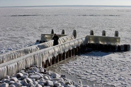 Icicles coating a jetty on the frozen inland Ijsselmeer Sea north of Amsterdam drew photographers, while those hanging a house in the central German city of Erfurt attracted the attention of firefighters, who snapped them off.