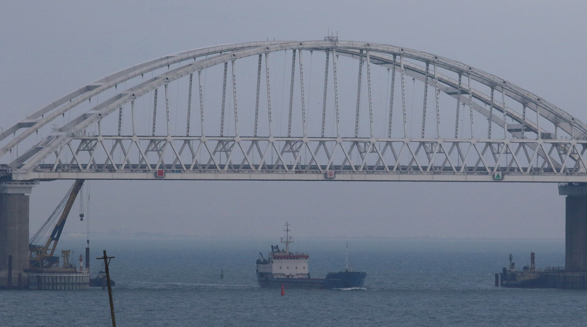 Two Russian police officers with automatic rifles stood on the pier where the Ukrainian vessels were moored. The vessels bore traces of collisions and big holes in places.