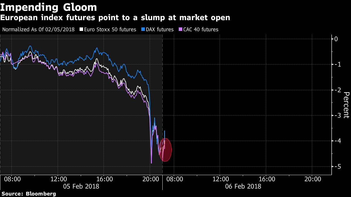 Contracts on the Euro Stoxx 50 Index, Germany’s DAX Index and France’s CAC 40 Index fell more than 3 percent as of 7:39 a.m. in London, while the U.K.’s FTSE 100 Index lost 2.8 percent. After a strong start of 2018, most European stock benchmarks have wiped out gains for the year in a rout that looks set to extend into a seventh day for the broader regional benchmark, hurt by worries over rising government bond yields and the outlook for the Federal Reserve’s interest rates.