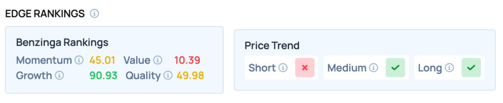 Tesla offers Satisfactory Momentum and Quality, while scoring well on the Growth metric, but offering poor Value. For more such insights, sign up for Benzinga Edge Stock Rankings today!