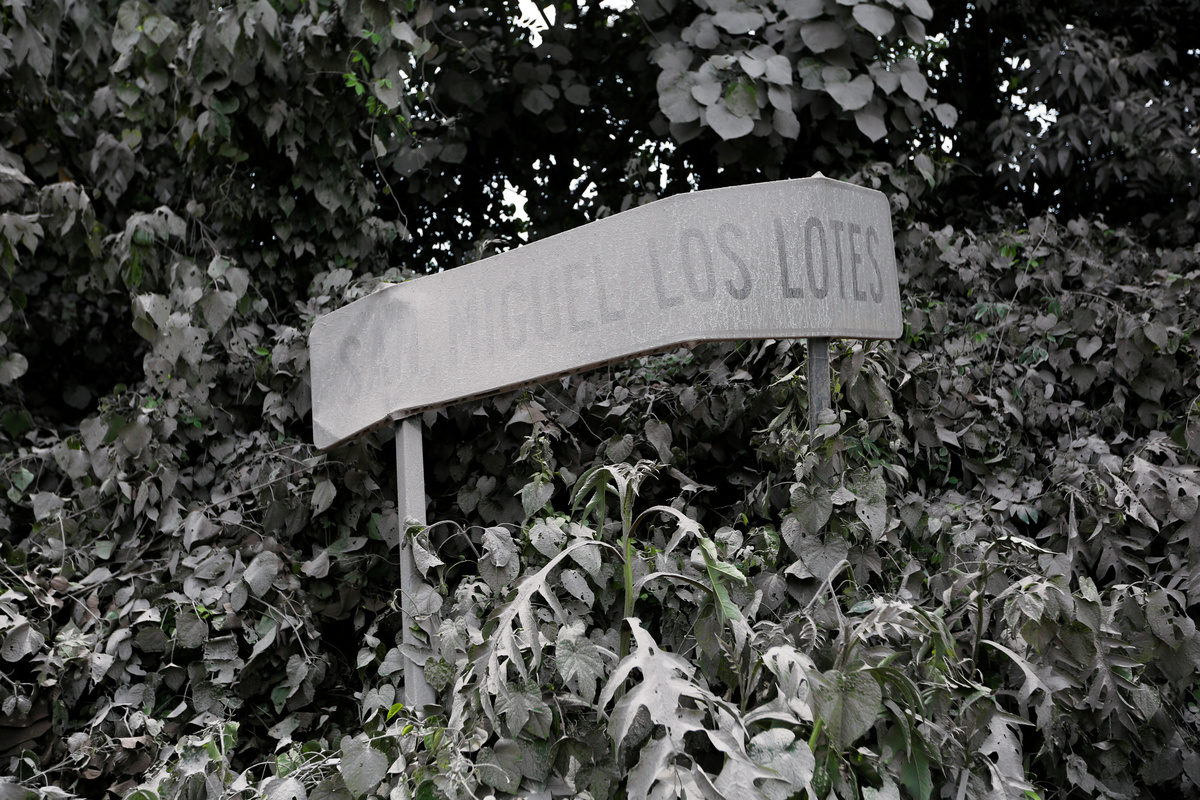 A road sign covered with ash is seen after Fuego volcano erupted in Escuintla, June 4, 2018. REUTERS/Luis Echeverria