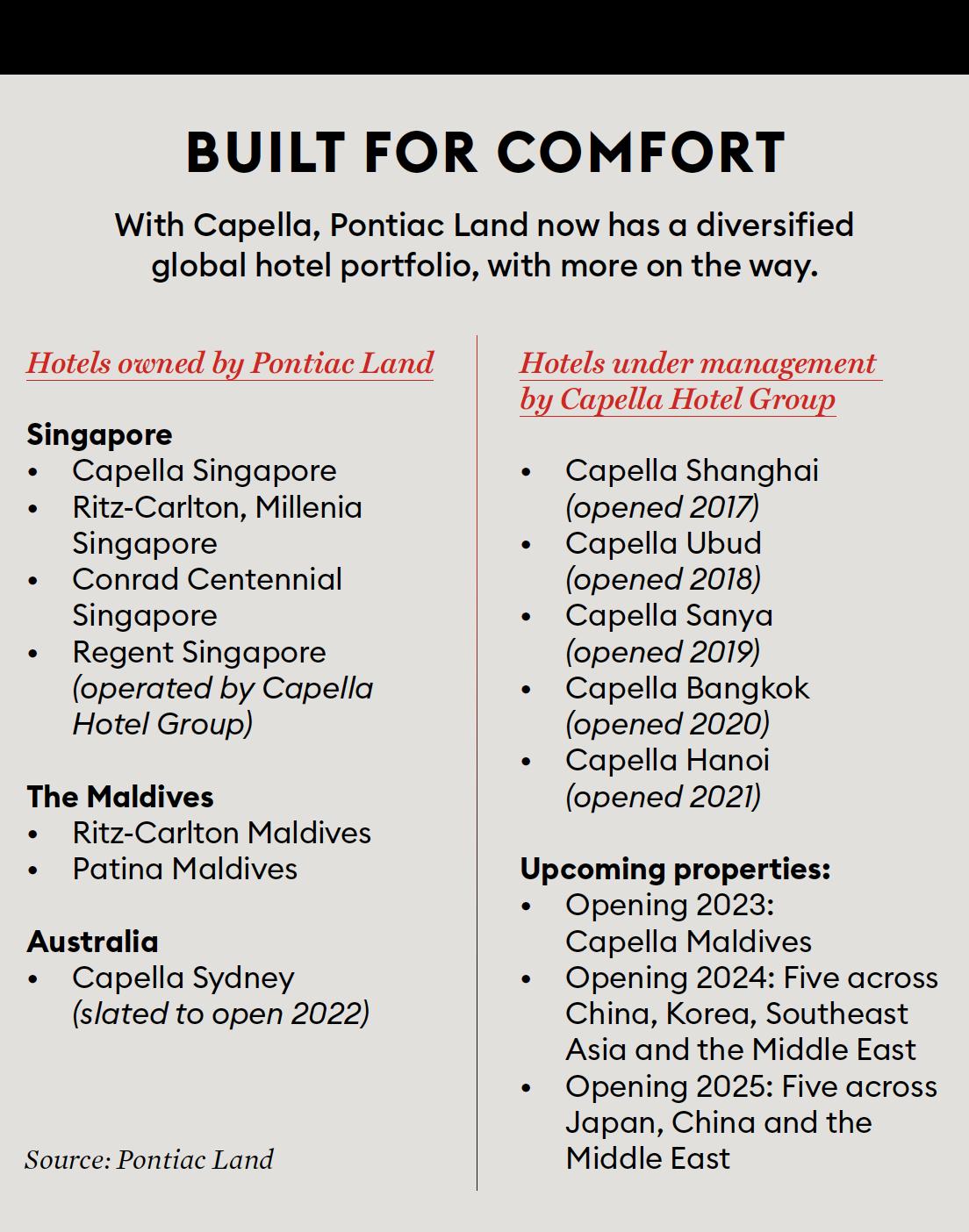 Another 10 Capella-operated hotels are on track to open in China, Japan, the Middle East and Southeast Asia over the next four years as well as Pontiac Land’s A$300 million ($223 million) redevelopment in Sydney. “Opening in 2023-plus for most markets should be good timing when it comes to pandemic recovery pace,” says Horwath HTL’s Hecker. “Pontiac Land would certainly like to see Capella continue to grow globally.” While the main growth is expected to come from its third-party management contracts, the group is also pushing ahead with development projects such as the Maldives.