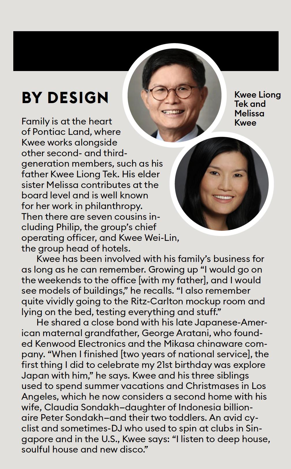 This year marks the company’s sixth decade—the privately held group was founded in 1961 by Evan’s grandfather, Henry Kwee, a wealthy Indonesian textile merchant who relocated to Singapore in 1958 (he died in 1988). Three generations of Kwees have grown Pontiac Land into one of the largest privately held family-owned property groups in Singapore. It now has over S$10 billion ($7.4 billion) in assets under management, comprising the group’s commercial, hotel, residential and retail holdings. It is known for its iconic mixed-use projects such as Millenia Singapore which includes the group-owned Ritz-Carlton and Conrad Centennial hotels.