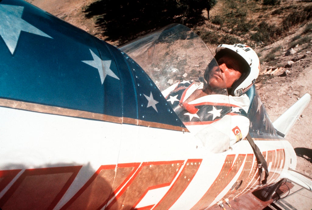 Evel Knievel was seriously injured many times during more than 75 motorcycle jumps. He survived a 1974 rocket-motorcycle shot over Snake River Canyon in Idaho that ended with the machine parachuting to the riverbank below.