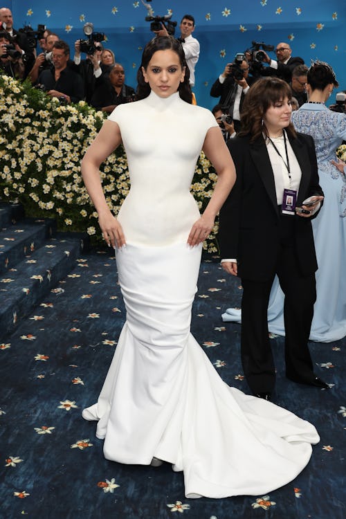 - Rosalía stunned in a white sculptural dress by Balmain, accompanied by designer Olivier Rousteing.