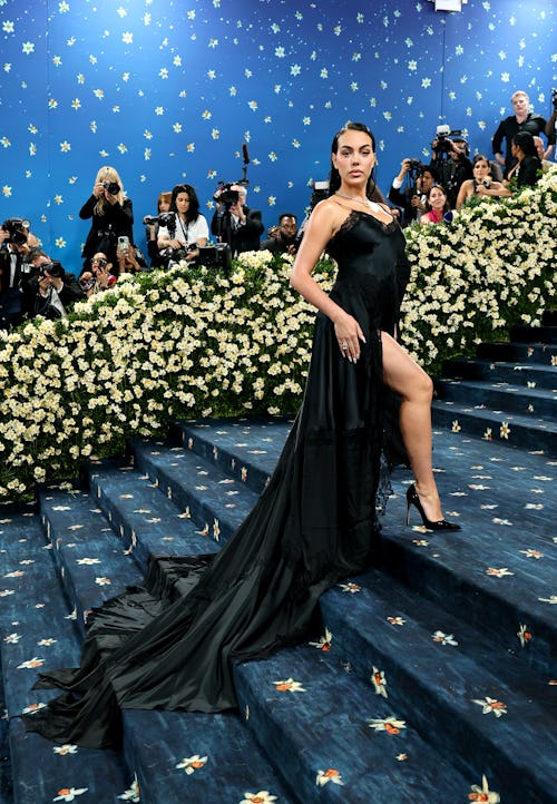 - Georgina Rodríguez made her debut in a black silk and lace slip dress by Vetements, featuring a prominent thigh-high slit and a long train.