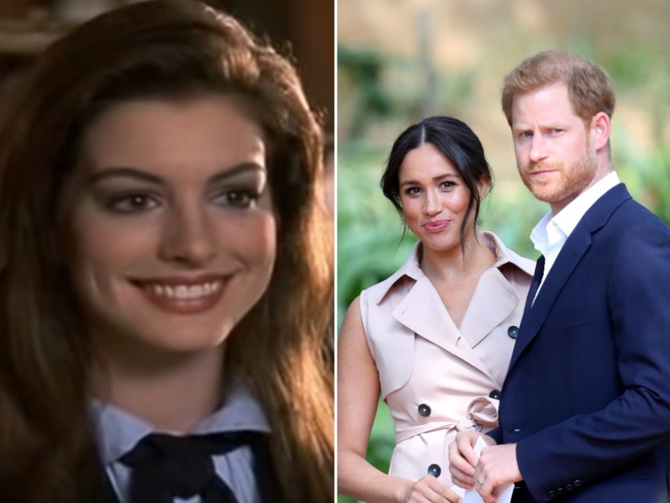 (Left) Anne Hathaway as Princess Mia Thermopolis (Right) Prince Harry and Meghan Markle