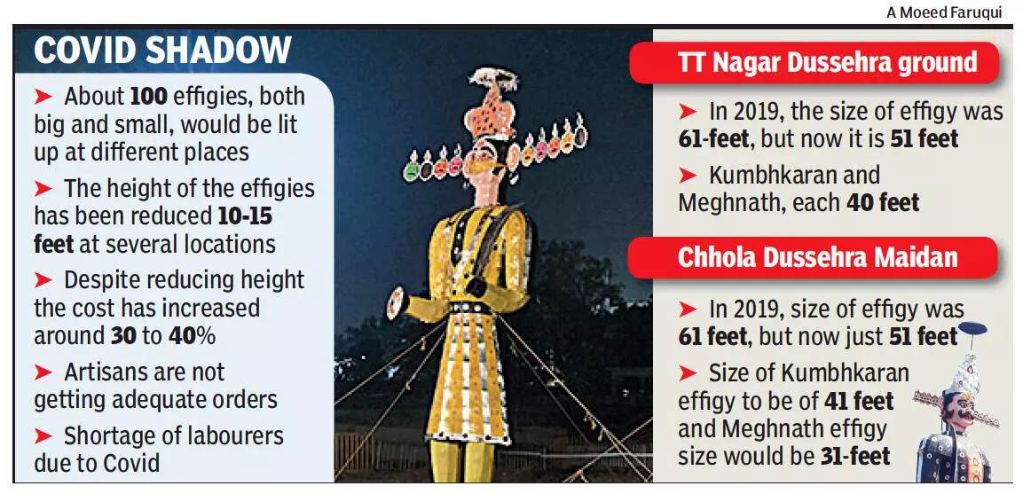 Kailash Begwani, president of Bhopal Hindu Utsav Samiti for the past six years, told TOI that the height of Ravana effigy at Chhola ground would be 51 feet this year, about 10 feet shorter that the previous years. “Previously we used to set up about 61-feet effigybut now due to covid, we have decided to reduce the height,” said Begwani, adding that apart from fund crunch, sfety of citizens is also a major concern.