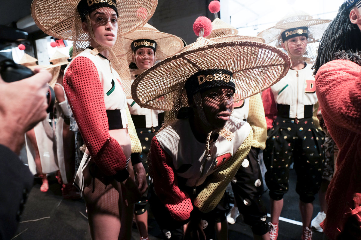 Models watch the runway from backstage at the Desigual Spring Summer 2018 collection show during New York Fashion Week in the Manhattan borough of New York City, U.S., September 7, 2017. REUTERS/Brenna Weeks