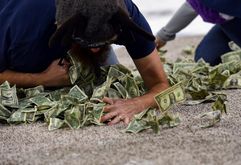 The “Dash For Cash” Saturday night in Sioux Falls was a competition in which 10 local teachers were selected to collect money for school projects. They had five minutes to collect as many of the 5,000 $1 bills that were spread out on carpet at center ice between periods at the Sioux Falls Stampede's arena.