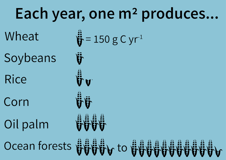 We found ocean forests are even more productive than many intensely farmed crops such as wheat, rice and corn. Productivity was highest in temperate regions, which are usually bathed in cool, nutrient-rich water. Every year, on average, ocean forests in these regions produce 2 to 11 times more biomass per area than these crops.