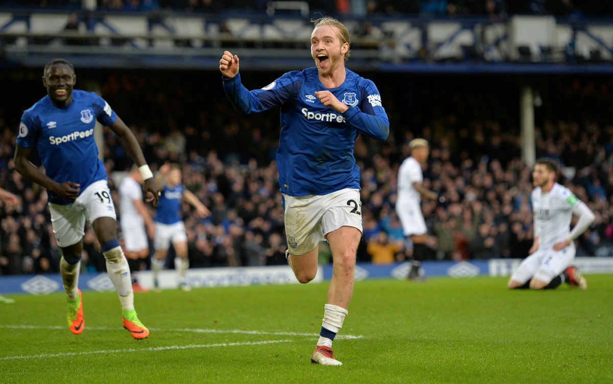 Soccer Football - Premier League - Everton vs Crystal Palace - Goodison Park, Liverpool, Britain - February 10, 2018 Everton's Tom Davies celebrates scoring their third goal REUTERS/Peter Powell