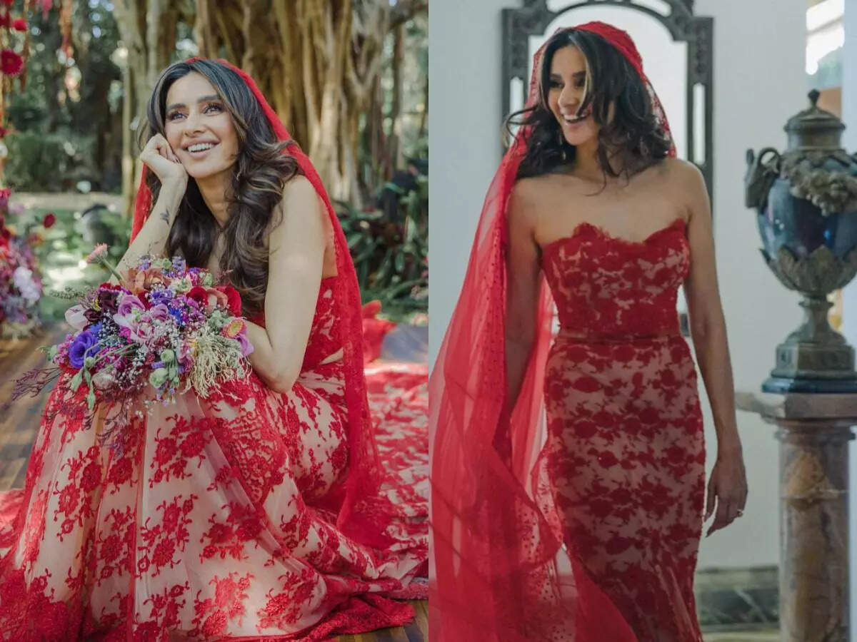 The mermaid-styled lehenga-gown came with a corset and an hourglass skirt with a dramatic train. She also opted for a red veil along with the outfit.