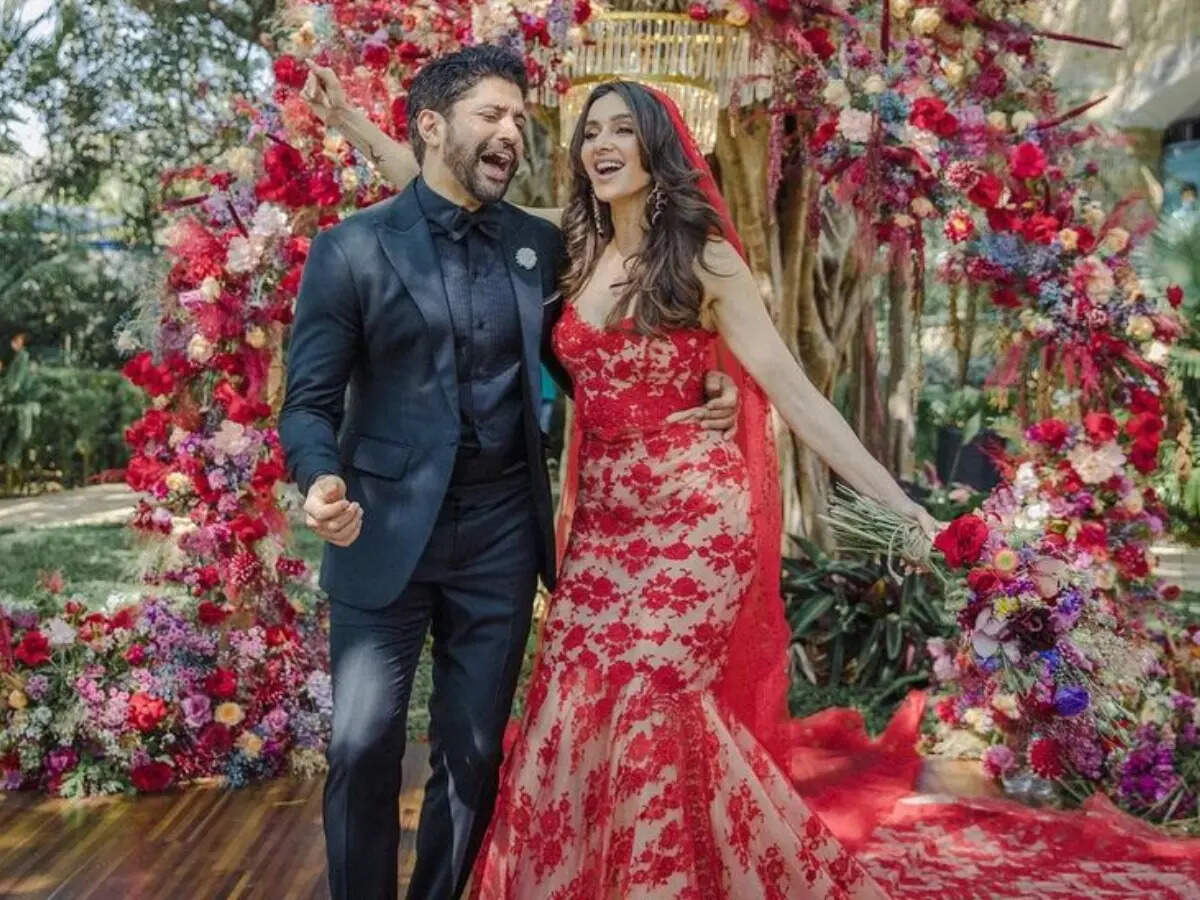 Shibani Dandekar walked down the aisle with Farhan Akhtar in a JADE by Monica and Karishma which was made of special French Chantilly Lace, and hand-embroidered by artisans.