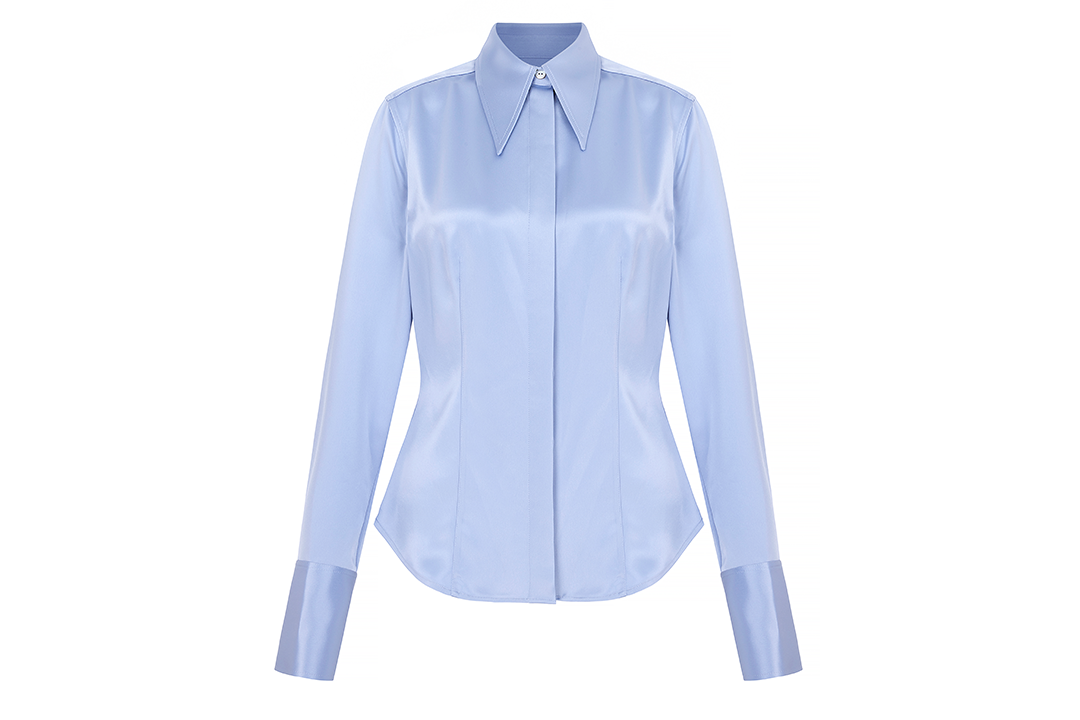 This silky pale blue shirt is the perfect match for layering under cashmere or tucking into a sequin mini skirt. Crafted from heavyweight satin, it features 16Arlington’s signature pointed collar. Completed with mother of pearl buttons and a fitted silhouette, the shirt adds an androgynous touch to any outfit.