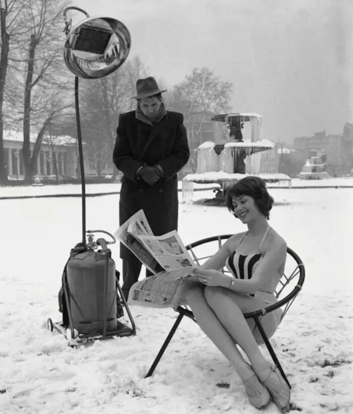 #40 Marion Liebig, Miss Hesse 1959, Keeps Warm Under The Artificial Sunshine Of An Infra-Red Lamp, During A Promotion For The Lamp, In A Snow-Covered Park In Wiesbaden, Germany, 1960