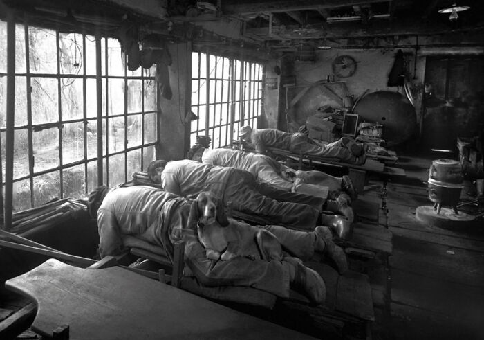 #20 French Knife Grinders In Thiers From The Early 20th Century. They Would Work On Their Stomachs To Save Their Backs From Being Hunched All Day And Had Dogs Sit On Their Legs For Warmth