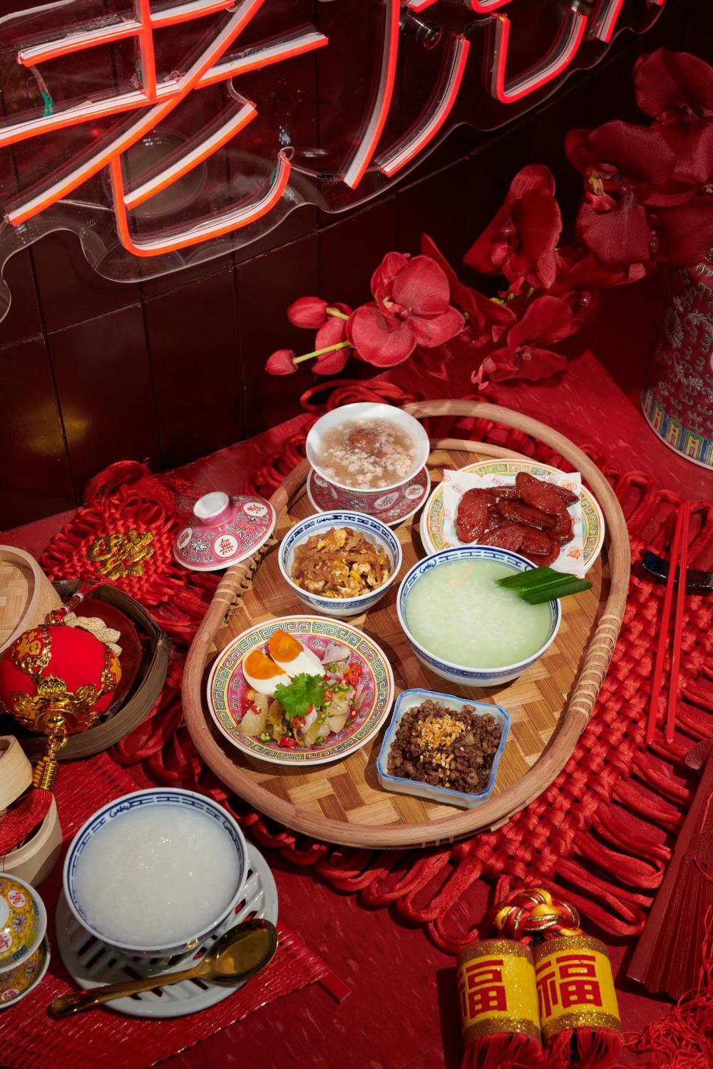The set encompasses two individual portions of pandan-seethed rice soup, a helping of minced pork in pickled plum consomme, a deep-fried sweet Chinese pork sausage, a wok-fried minced pork with Chinese black olive, a sour and spicy salad of salted egg and pickled cabbage and stir-fried sugar-cured turnip with egg.