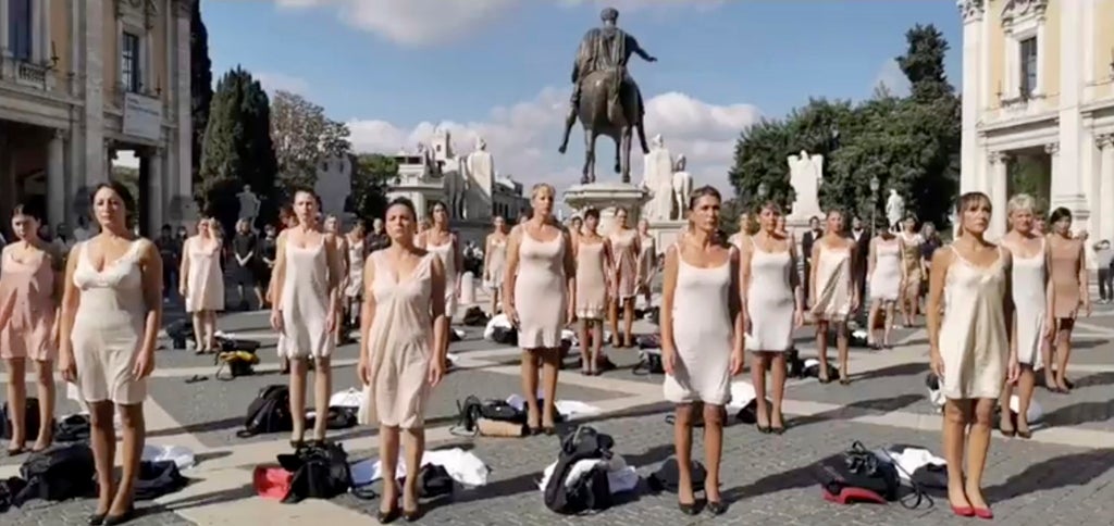 Some 50 former flight attendants stood in rows in a square atop Rome’s Capitoline Hill, lowered their company shoulder bags to the cobblestone pavement, then slowly and in synch, removed their overcoats, then uniform jackets, then skirts, then stepped out of their high-heeled shoes.