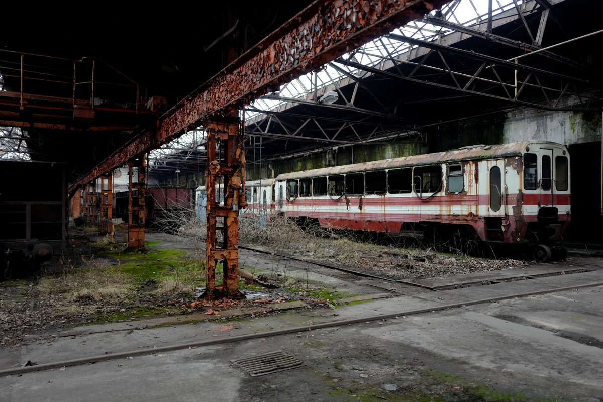 One such site is a derelict railway yard that once serviced narrow-gauge coal trains. Right now, it looks like a scene from a dystopian video game, with old carriages rotting away in damp, cavernous sheds.