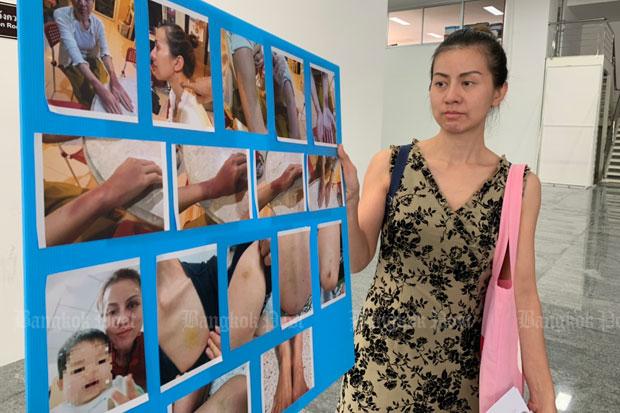 The 36-year-old woman, Busaratip Pusitrat, referred to herself as "A" when talking to reporters after filing a complaint at the Crime Suppression Division on Wednesday. She alleged her now estranged husband, her mother-in-law and a neighbour had assaulted her and prevented her visiting her toddler.