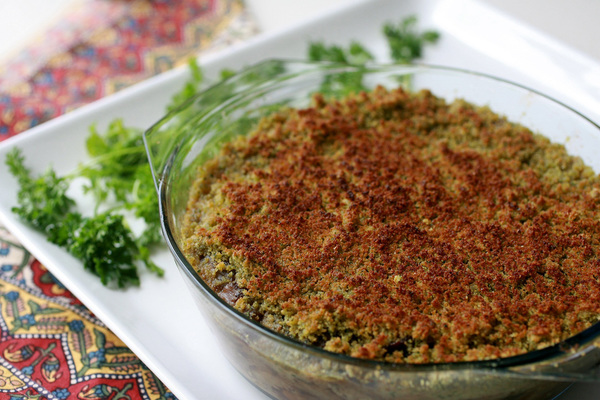 The lamb, eggplant and onions are all browned in olive oil and then braised in a cup of chicken stock. After it bakes, it is covered in a bread-crumb topping that adds an entirely new dimension because it is made with a lot of garlic. Also, butter and olive oil. It's hard to go wrong with butter and olive oil.