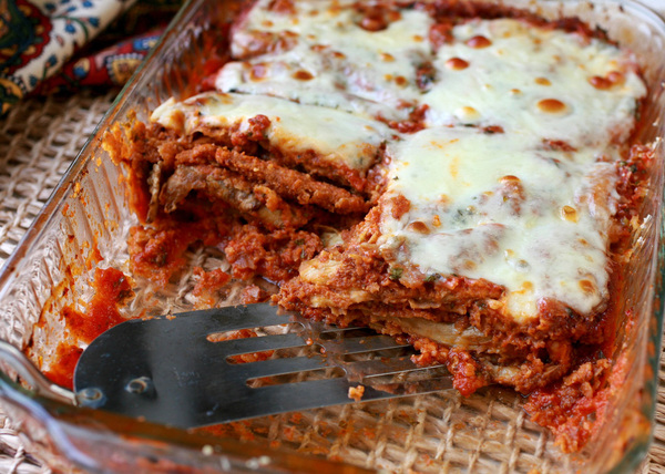 The tempura version tasted great, but it ended up being a little greasy when mixed with the other ingredients. For a sauce, I used my favorite, bright-tasting marinara, and between layers I sprinkled plenty of parmesan and mozzarella cheeses.
