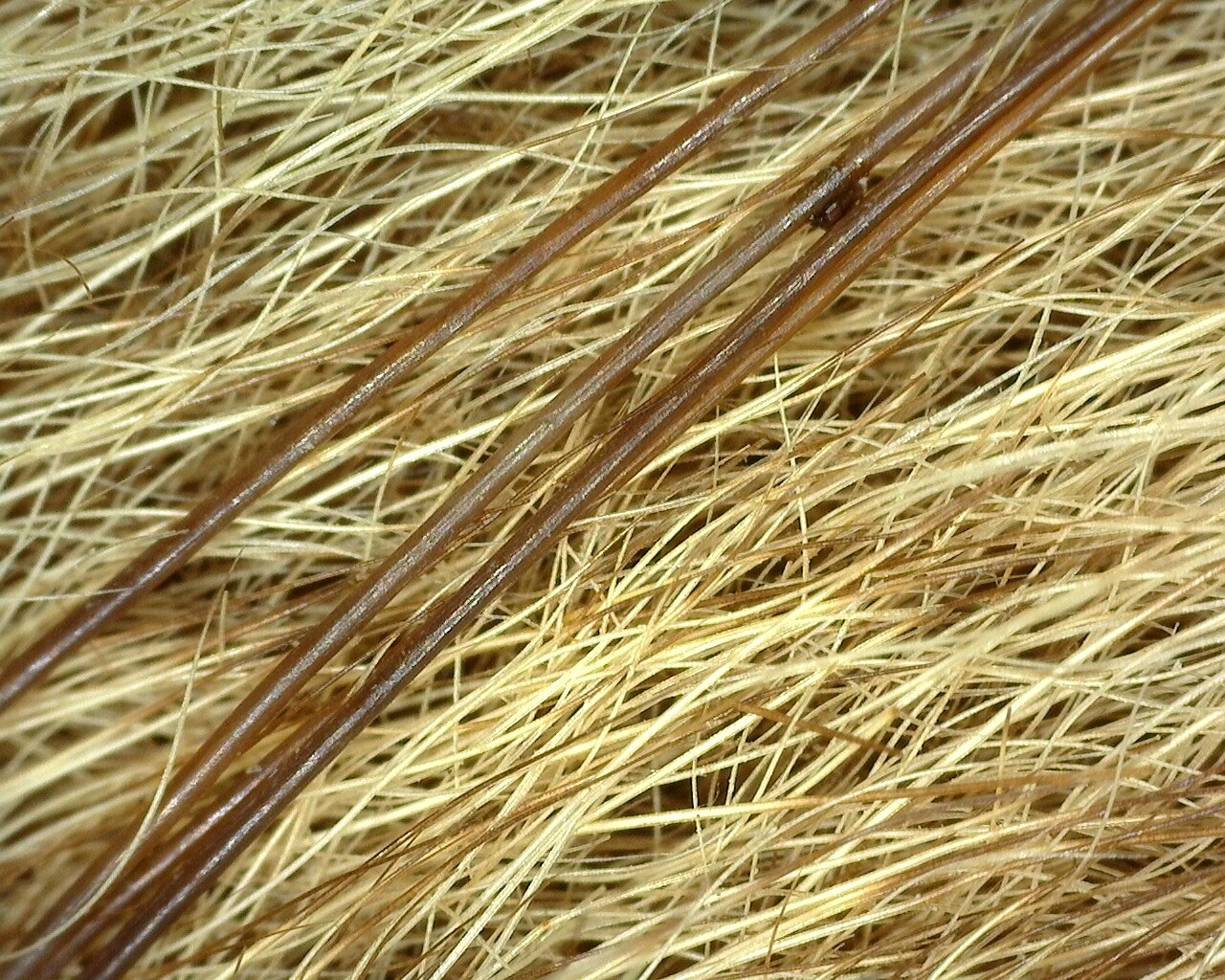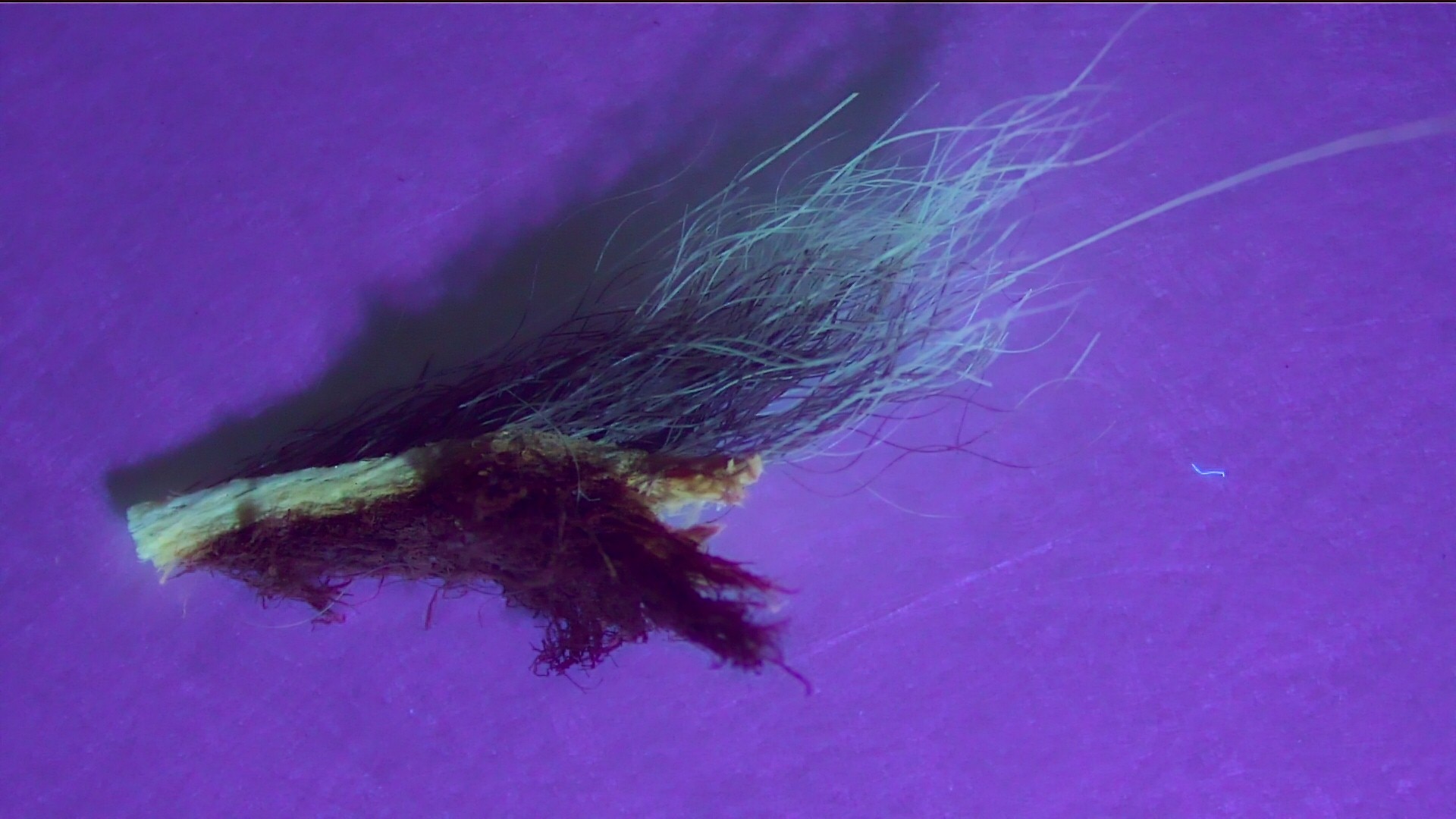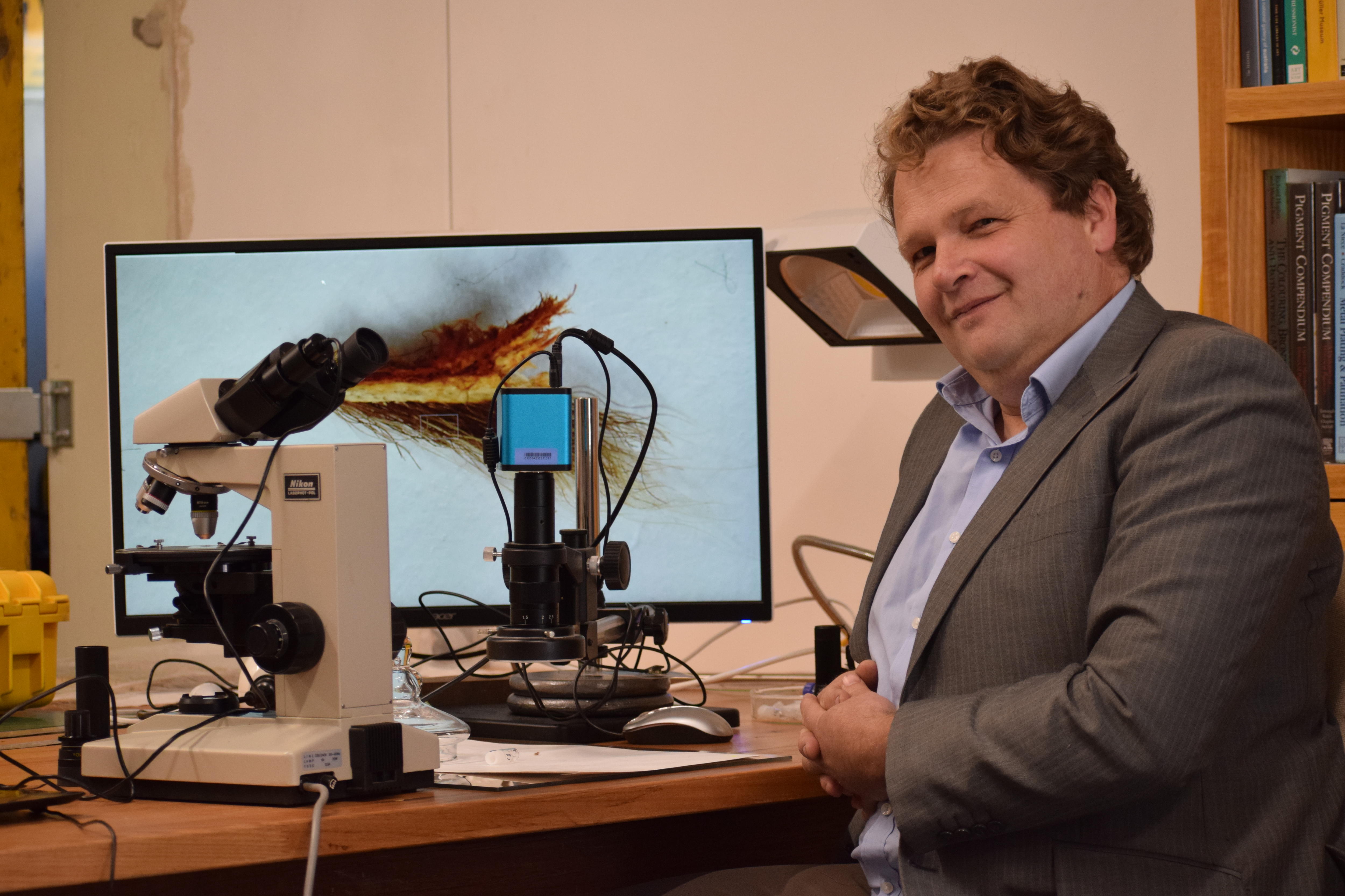 His microscope connects to screens that display the century-old dark and scraggly hairs.