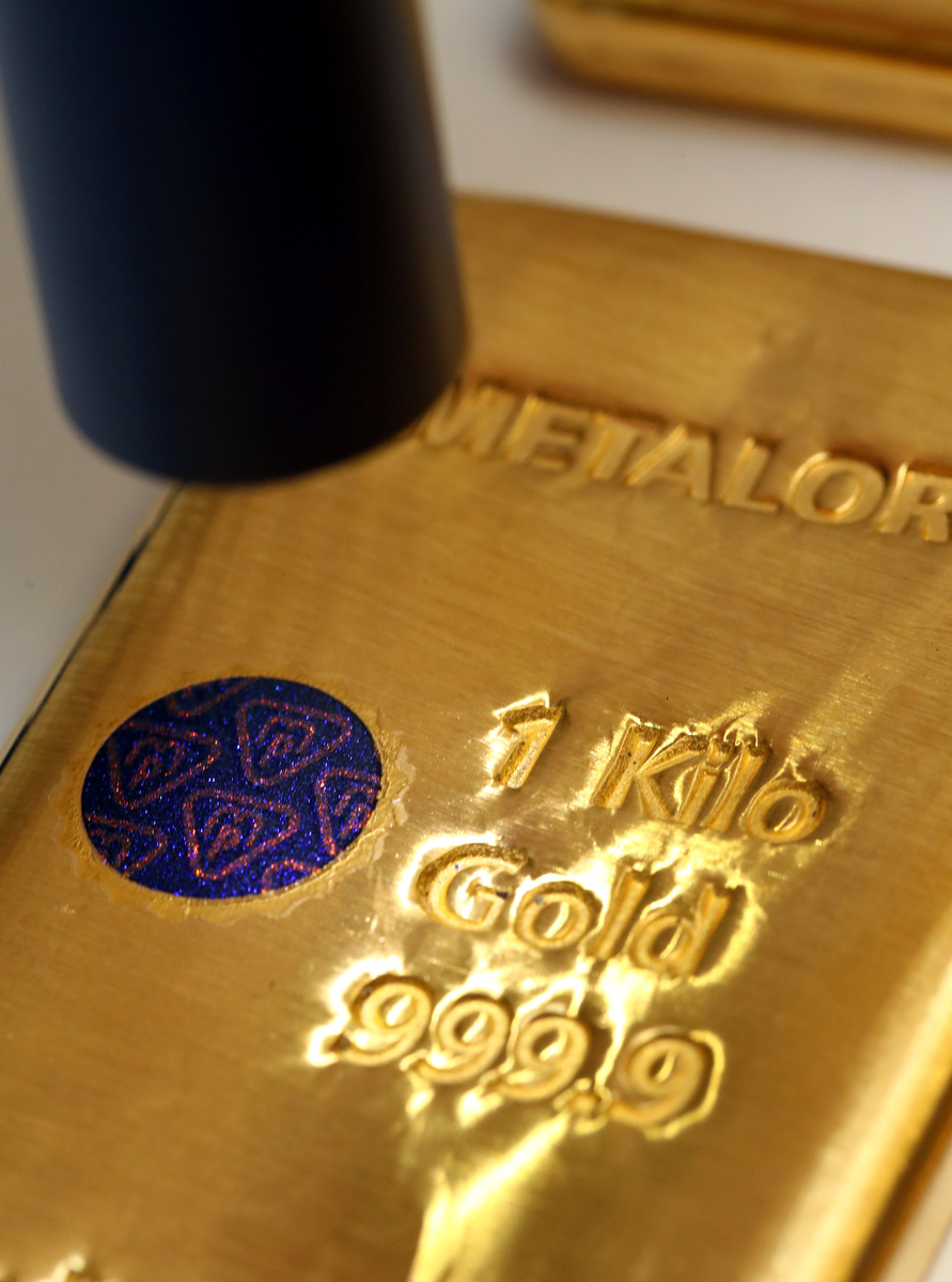 Metalor this year began to put spots of tamper-proof ink on its bars. Like the security features on banknotes, these display different features when viewed under certain light or through filters. PAMP and Valcambi perform a microsurface scan of their bars and supply machines or phone apps that can scan each one and verify whether their surfaces match the refinery's records. Argor said its bars had various security features, but declined to elaborate for security reasons.